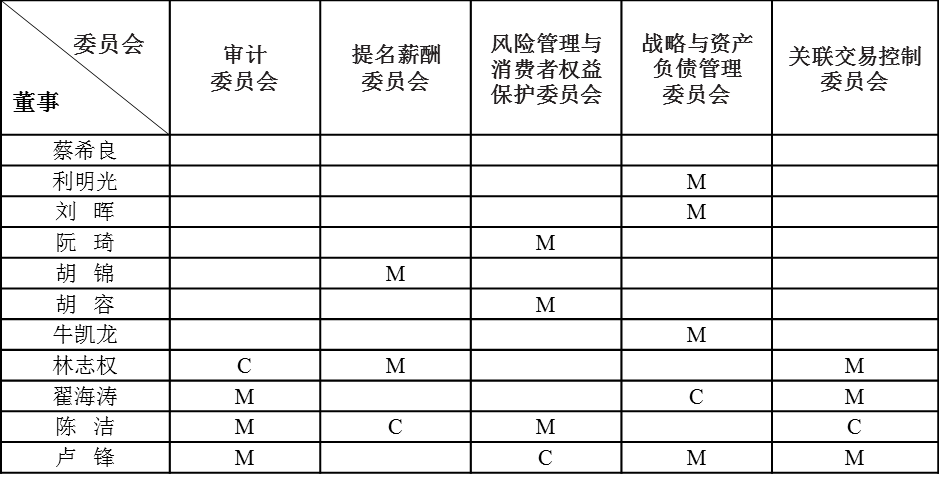 本公司董事会下设五个专门委员会,以监察公司相关专业的事务,包括审计委员会、提名薪酬委员会、风险管理与消费者权益保护委员会、战略与资产负债管理委员会和关联交易控制委员会。董事会辖下的委员会定期向董事会汇报工作进度及讨论结果,对董事会负责,按董事会通过的议事规则行事。